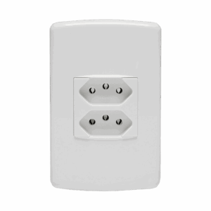 Conjunto Tomada 2P+T Duplex. Segurança: atende o novo padrão brasileiro que evita choques e inserções parciais. Atende as diretivas ROHs. Design inovador, fácil de instalar e limpar, com superfície em extra brilho. Agilidade na obra, com instalação até 70