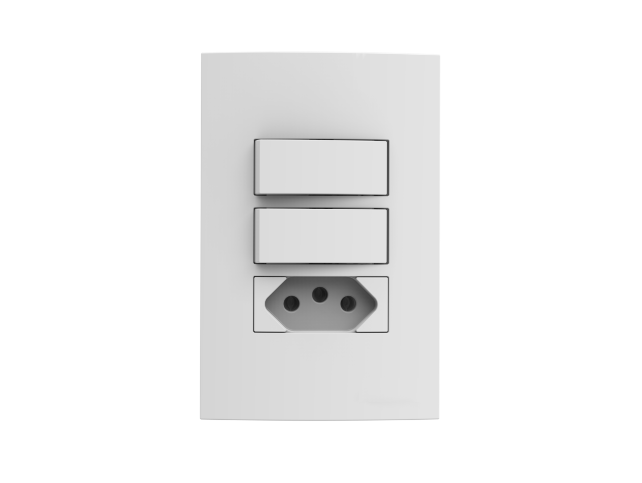 - Tipo: Conjunto 4×2 com 2 interruptores simples e 1 tomada 2P+T (3 pinos: fase, neutro e terra).